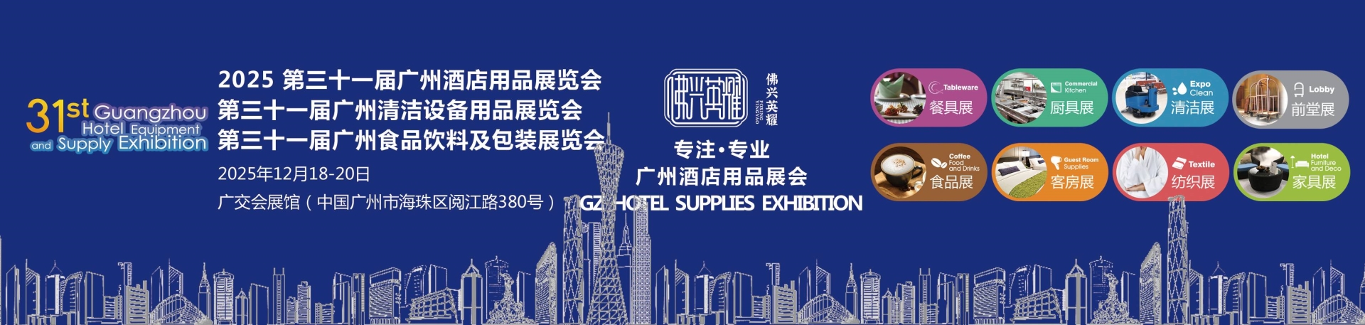 第三十一届广州酒店用品展览会是由广东佛兴英耀展览服务有限公司主办,于2025年12月18-20日在广州琶洲会展中心举行。本届展览会展览面积25多万平方米,参展企业4000多家,展品范围包括厨房设备、陶瓷餐具、玻璃器皿、清洁设备、客房用品、食品饮料等酒店用品门类的上下游全产业链。预计展会期间观众人数像往年一样,每天有10多万国内外的观众前来参观订货。本届展览会是国内外酒店用品行业的一个盛会。