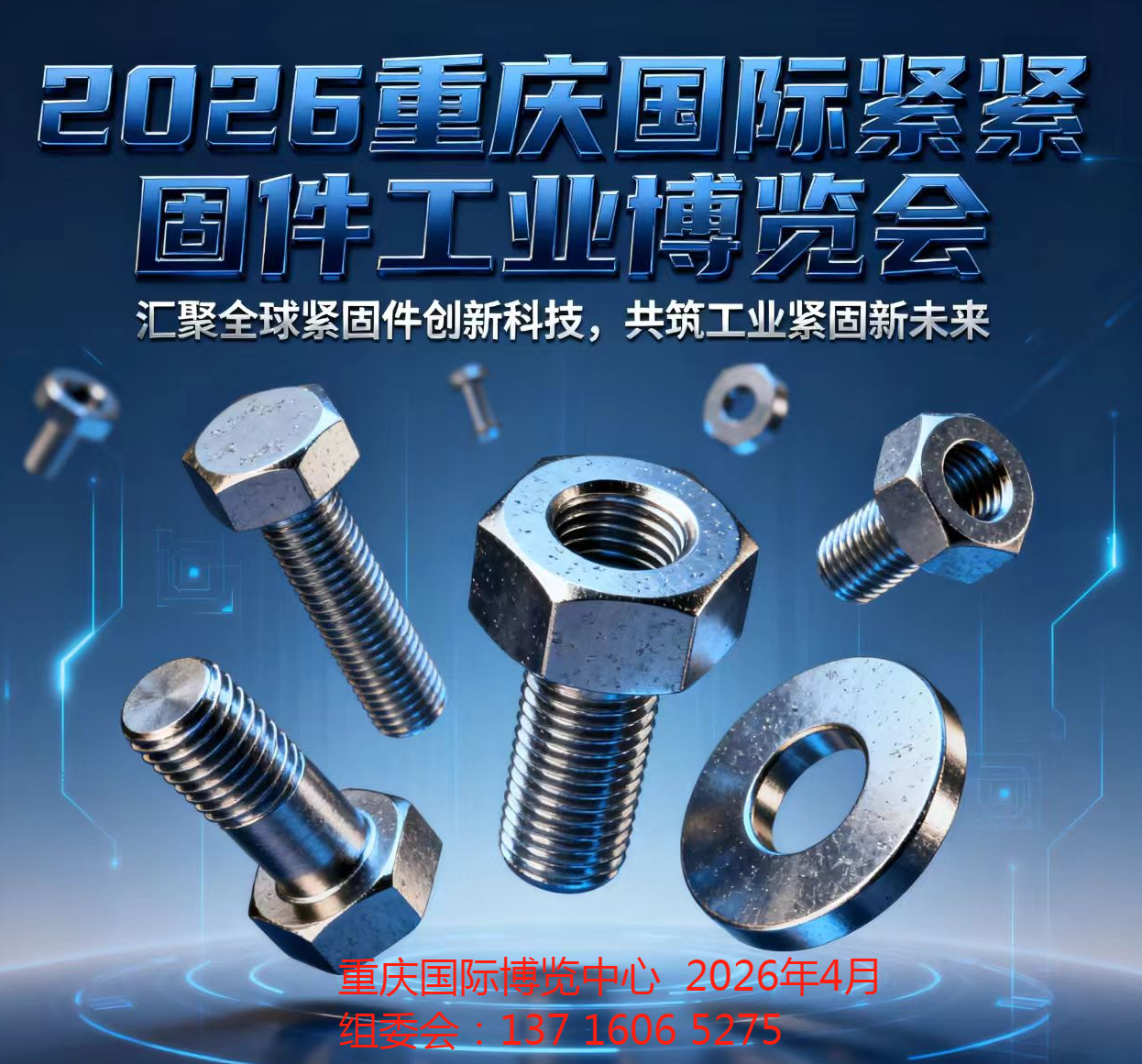 自西部大开发战略实施以来,党中央、国务院出台一系列发展规划与重点支持政策,推动西部地区经济社会跨越式发展。立足比较优势,发展特色产业。西部地区大力推动新能源、新材料、生物技术、航空航天等战略性新兴产业发展,新能源汽车、光伏电池等正成为西部产业新名片,光子、氢能、低空经济、人工智能等领域成为投资蓝海,一大批未来产业正蓄势待发。 作为“工业之米”,紧固件在工业领域中扮演着至关重要的角色,它们如同一条条无形的“纽带”不仅承载着连接机械装备的基础使命,更在高端装备制造、新能源产业、航空航天等领域展现出重塑产业格局的革命性潜力。 2026中国西部国际紧固件工业博览会,将于4月10-12日在重庆国际博览中心举行。展会规划总面积 35000 平方米,将会吸引国内外参展企业700 余家,同时将邀请来自全国范围内近 23000 名专业观众参观洽谈。集企业展示、贸易采购、会晤交流、合作拓展于一体的综合性线下盛会,为紧固件行业与世界沟通搭建了桥梁。