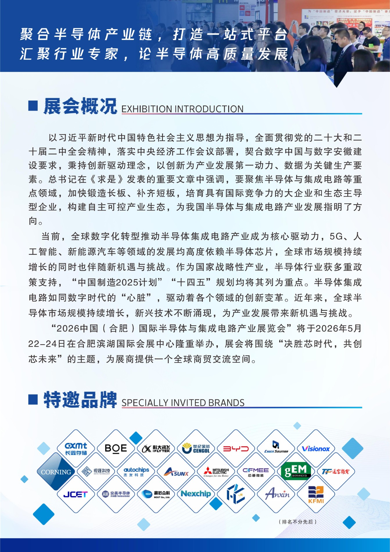 当前,全球数字化转型推动半导体集成电路产业成为核心驱动力,5G、人工智能、新能源汽车等领域的发展均高度依赖半导体芯片,全球市场规模持续增长的同时也伴随新机遇与挑战。作为国家战略性产业,半导体行业获多重政策支持,“中国制造2025计划”“十四五”规划均将其列为重点。半导体集成电路如同数字时代的“心脏”,驱动着各个领域的创新变革。近年来,全球半导体市场规模持续增长,新兴技术不断涌现,为产业发展带来新机遇与挑战。“2026中国(合肥)国际半导体与集成电路产业展览会”将于2026年5月22-24日在合肥滨湖国际会展中心隆重举办,展会将围绕“决胜芯时代,共创芯未来”的主题,为展商提供一个全球商贸交流空间。